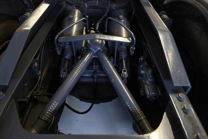 大梁两侧的附件完全隐藏于侧裙板内,上世纪70年代的车型已经在用V型推力杆了。